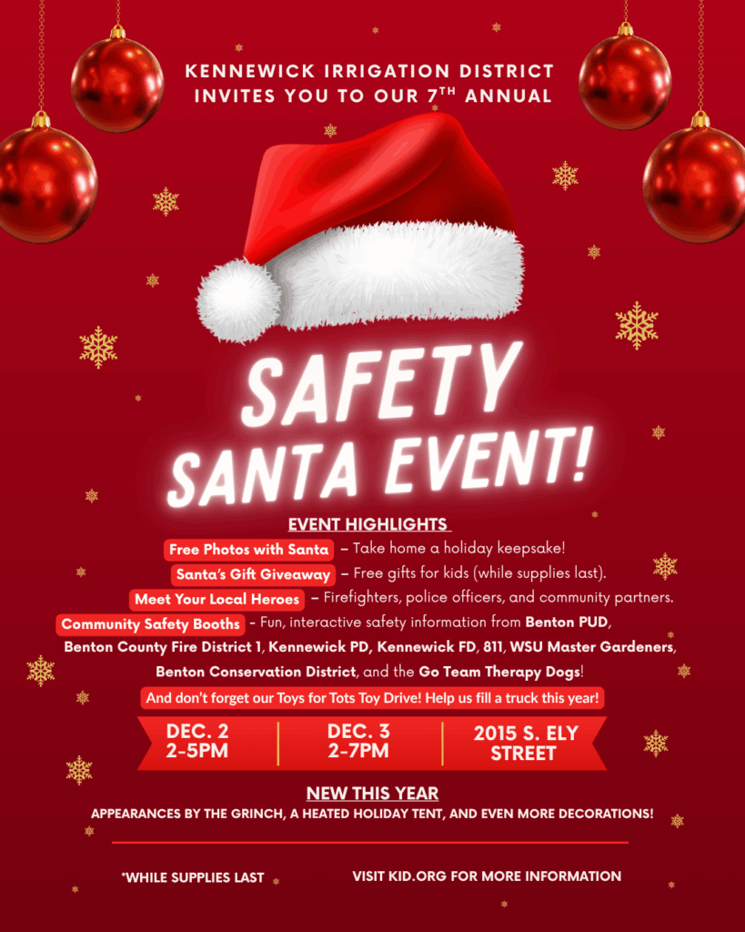 The Kennewick Irrigation District’s 7th Annual Safety Santa Event blends holiday magic with hands-on safety fun for the whole community. Expect free photos with Santa, a kids’ gift giveaway (while supplies last), meet-and-greets with local heroes, and interactive safety booths from partners like Benton PUD, Benton County Fire District 1, Kennewick PD/FD, WSU Master Gardeners, and more. New this year: a cozy heated party tent, extra twinkle lights with an extended photo backdrop and red carpet, plus surprise cameos from the Grinch and fan-favorite Otto the Otter.